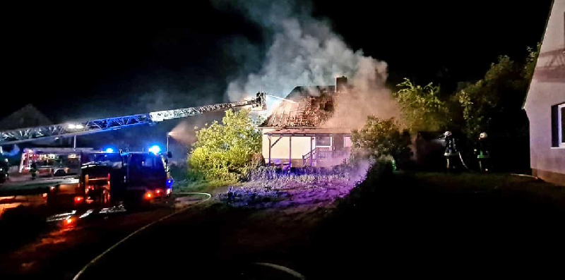 Schon bei der Anfahrt sah es größer aus und wir wussten, dass es länger dauern wird. Von Weitem war das Scheinen der Flammen zu sehen. Leider griff das Feuer sehr schnell auf das angrenzende Wohnhaus über. Das Feuer lief schnell unter das Dach und verbreitete sich dann über das ganze Gebäude.