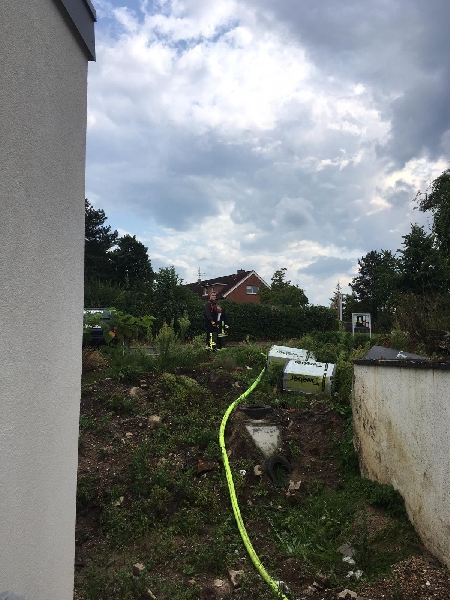 Vor fast genau einem Jahr, am 25.07.2018, mussten wir bereits schon einmal während der Baumaßnahmen die Lagerräume auspumpen. Dieses Mal stand der Keller ca. 1 m unter Wasser. Der Einsatz dauerte von 15:24 Uhr bis 20:00 Uhr.