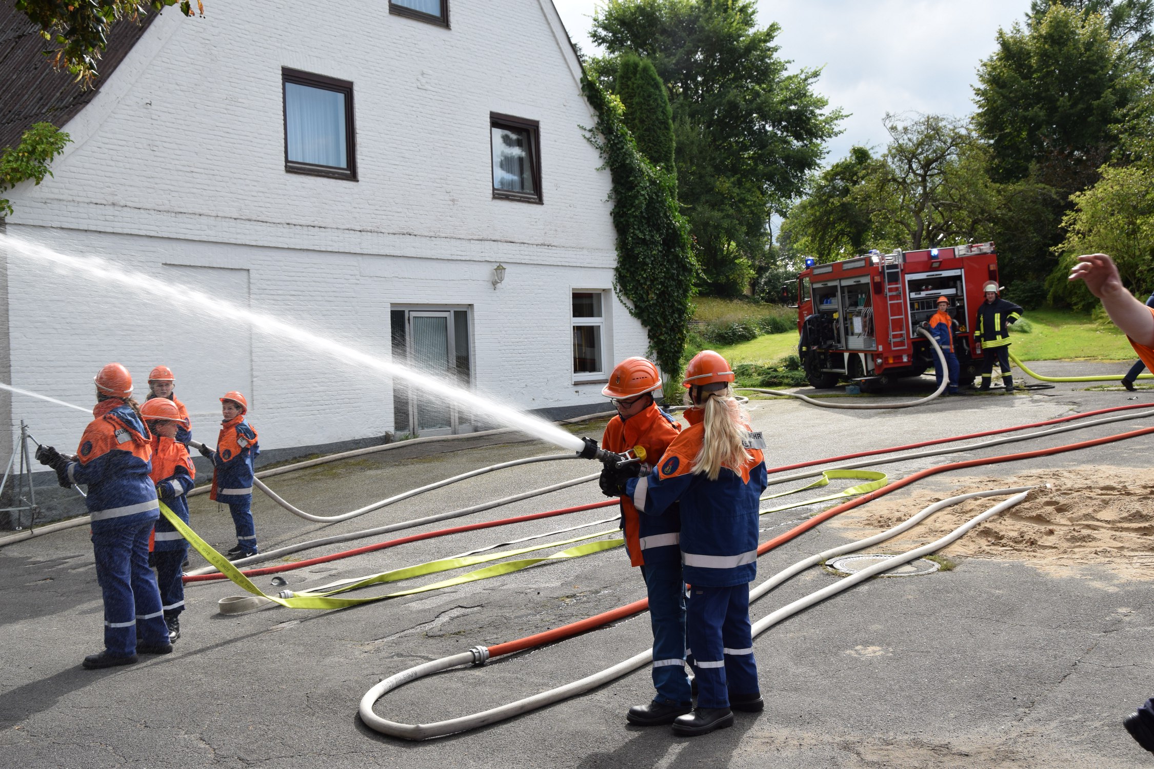 Die aktiven Einsatzkräfte haben zweimal die Reaktion des Löschens eines Fettbrandes mit Wasser vorgeführt. Der Nachwuchs zeigte in seiner ersten Übung einen Löschangriff, wie er nach Feuerwehrdienstvorschrift 3 gelehrt wird. Wozu die einzelnen Strahlarten zu gebrauchen sind, erklärte Jugendfeuerwehrwart Frank Künemund. In der zweiten Übung wurde ein improvisierter Wasserwerfer (Wasserkanone) aufgebaut.